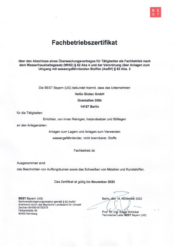 Die HeGo Biotec GmbH verfügt seit dem 31.10.2018 über ein Fachbetriebszertifikat nach Wasserhaushaltsgesetzt (WHG) § 62 Abs. 4 sowie der Verordnung über Anlagen zum Umgang mit wassergefährdenden Stoffen (AwSV) § 62 Abs. 2.